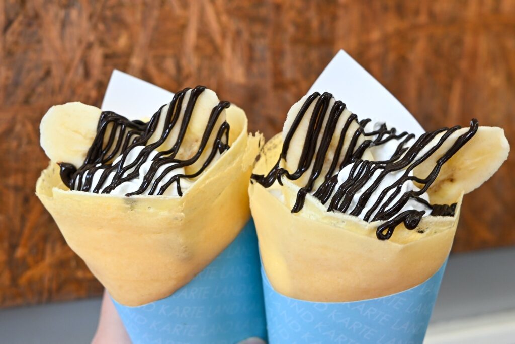 定番のチョコバナナはもちろん、表面をキャラメリゼした「賞味期限5分」のブリュレクレープは特別感たっぷり。パリッと割れる瞬間と、とろける甘さは週末だけのご褒美スイーツにぴったりです。